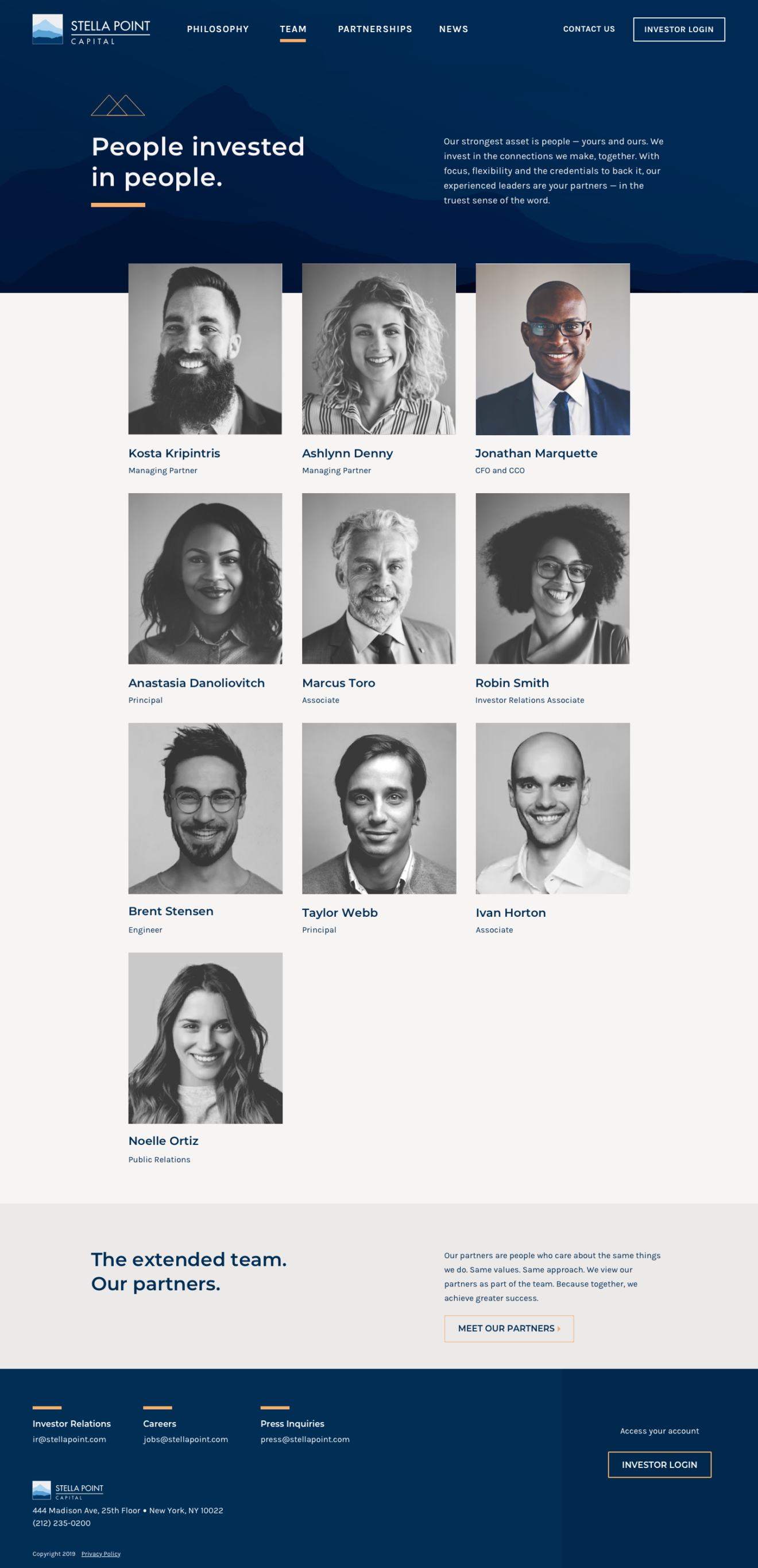 Some main objectives were modernizing the look and feel of the site as well as allowing current and prospective clients to find and contact members of Stella Point’s team.
